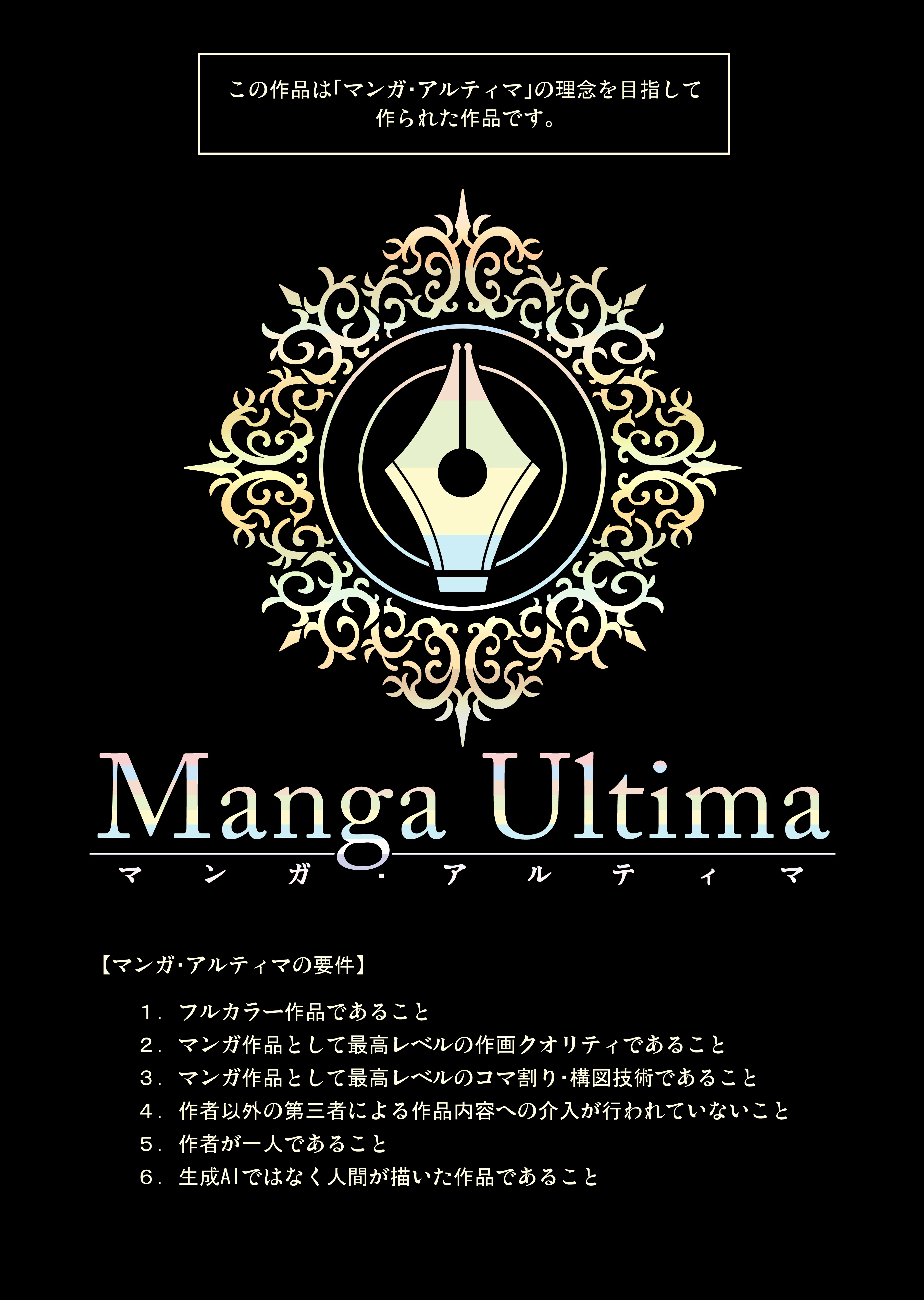 マンガ・アルティマという概念の提案は、人間の手による創作の価値と尊厳をみつめなおす機会としたい、という動機をもっています。よって、マンガ・アルティマは生成AIが生成した画像ではなく、人間の手によって描かれた創作物であることを保証するアイコンでありたいと考えます。
