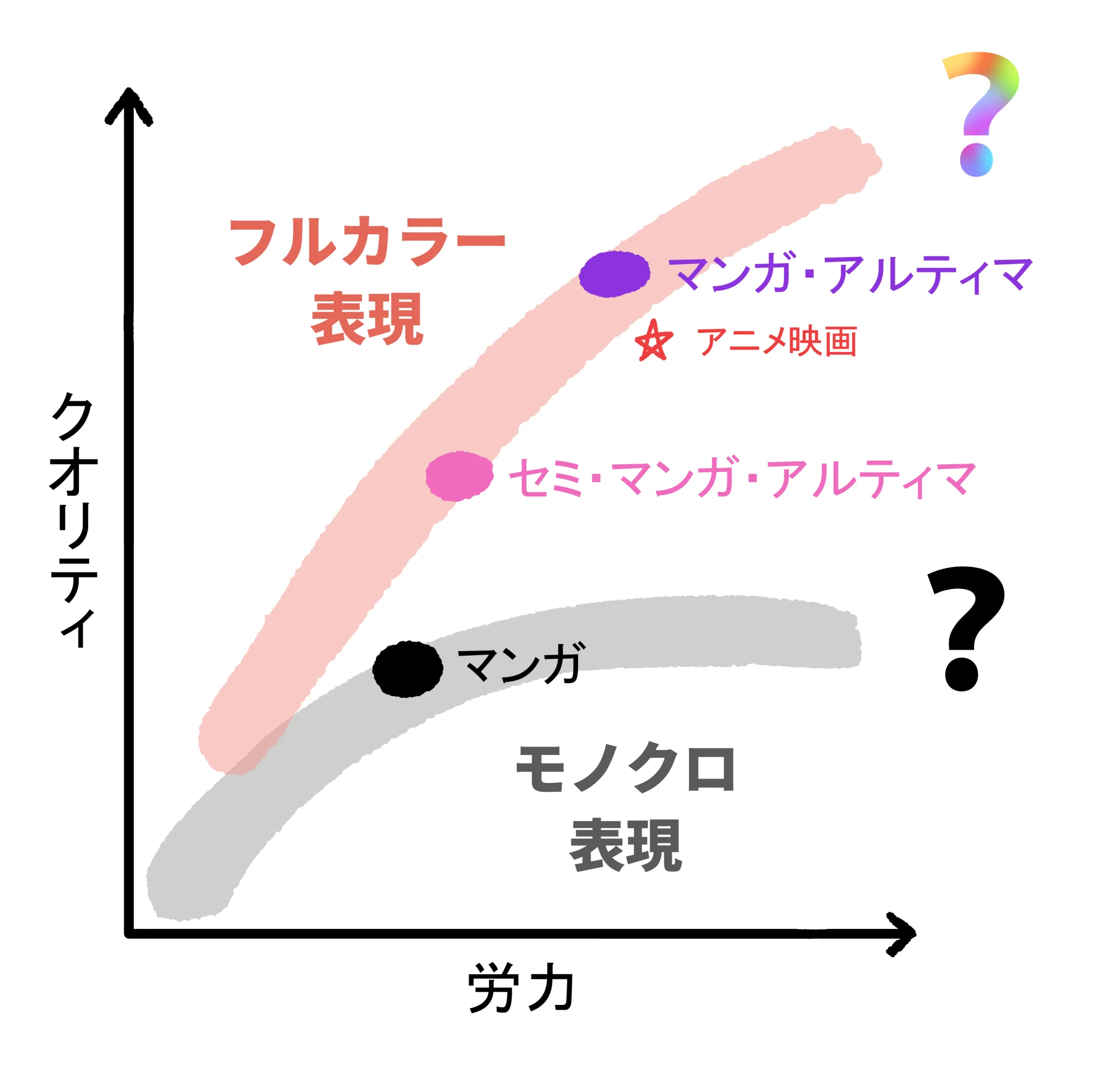以下に、マンガ・アルティマが目標とするニッチを示します。マンガ・アルティマは商業作品には難しい最高品質のニッチを目指します。